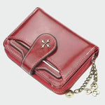 Modern pénztárca fekete színben, elegáns dizájnnal és praktikus részletekkel. Zárral ellátott fedéllel és fém díszítéssel rendelkezik, valamint láncos cipzárral és bájos lógó modellel. Kompakt mérete ideálissá teszi a mindennapi használatra, miközben elegendő helyet biztosít kártyák, érmék és bankjegyek számára.