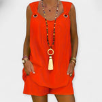 A tökéletes nyári elegáns szett, amely ötvözi a frissességet és az eleganciát. Az ujjatlan blúz V-nyakú dekoltázsa finoman kiemeli a nyakat, míg a rövidnadrág kényelmes viseletet és nőies sziluettet kínál. Modern szett a nap bármely pillanatára.