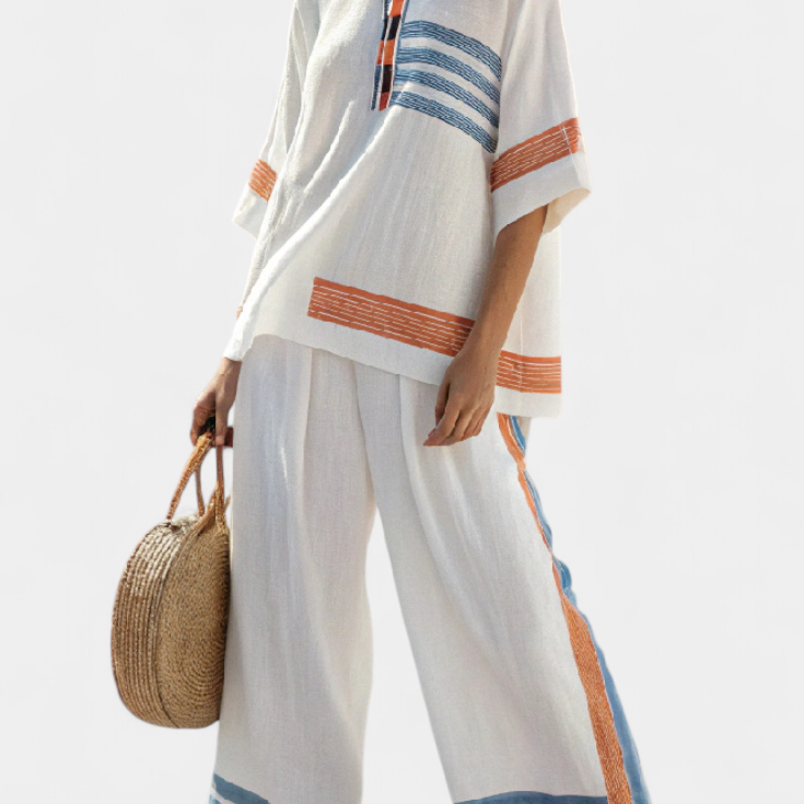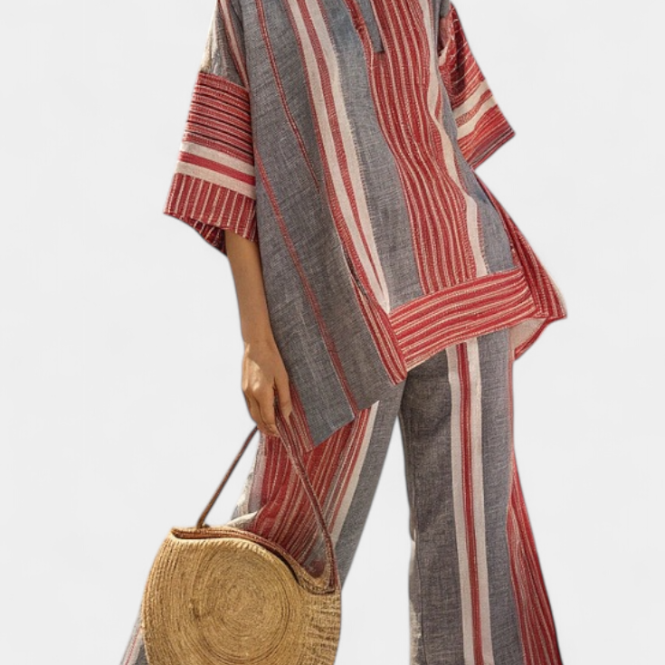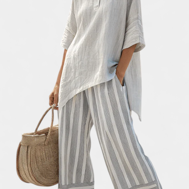 Csíkos bambusz felső, nyitott vállakkal és széles nadrágokkal az elegáns és friss stílusért