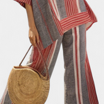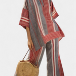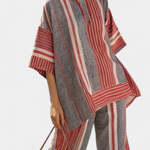 Mediterrán stílus laza hangulattal. A Daisy kombinációs ruha piros korall színű csíkokat ötvöz szürke kő árnyalatokkal, széles és folyékony sziluettel, amely a nyarat és az autentikusságot idézi.