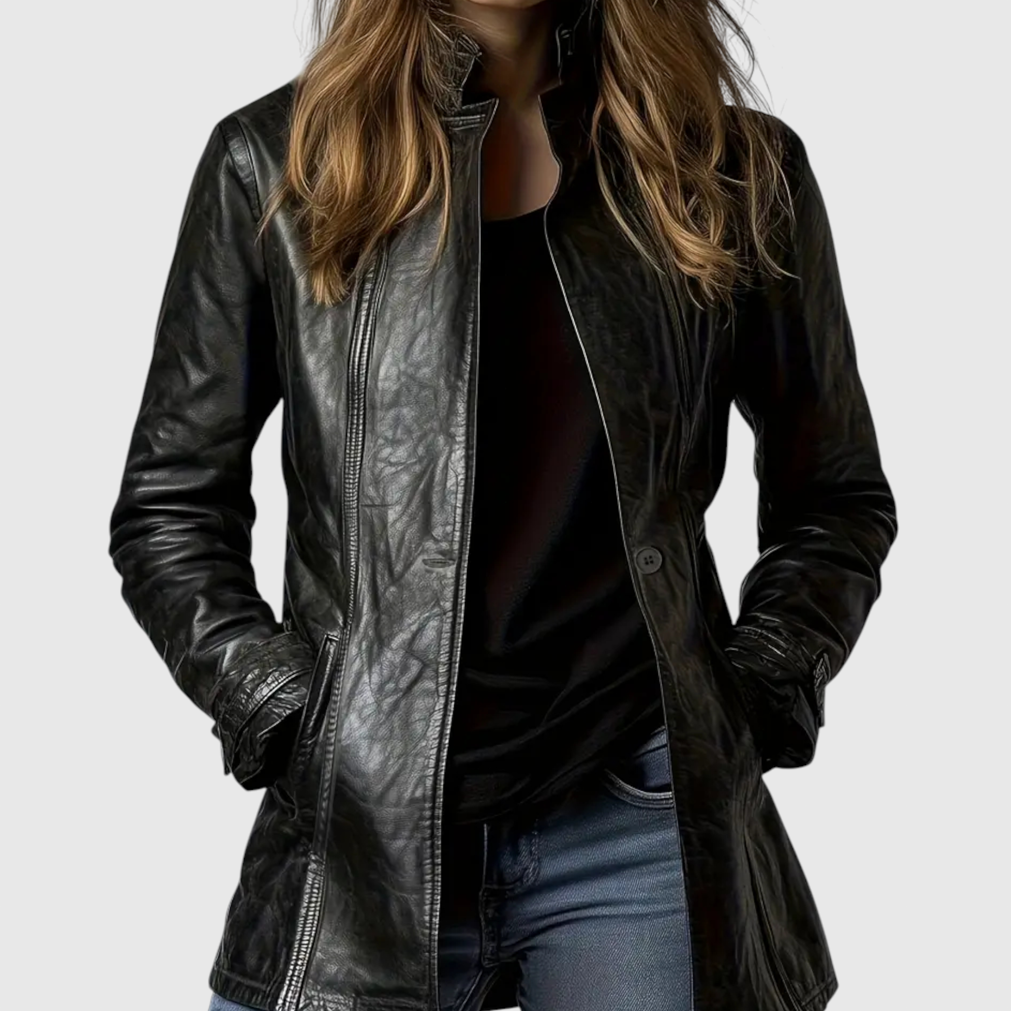 Elegáns bőrkabát modern sziluettel és örök esztétikával