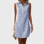 • Klasszikus csíkok – A kék-fehér csíkok meghosszabbítják a sziluettet, és időtlen megjelenést kölcsönöznek a ruhának