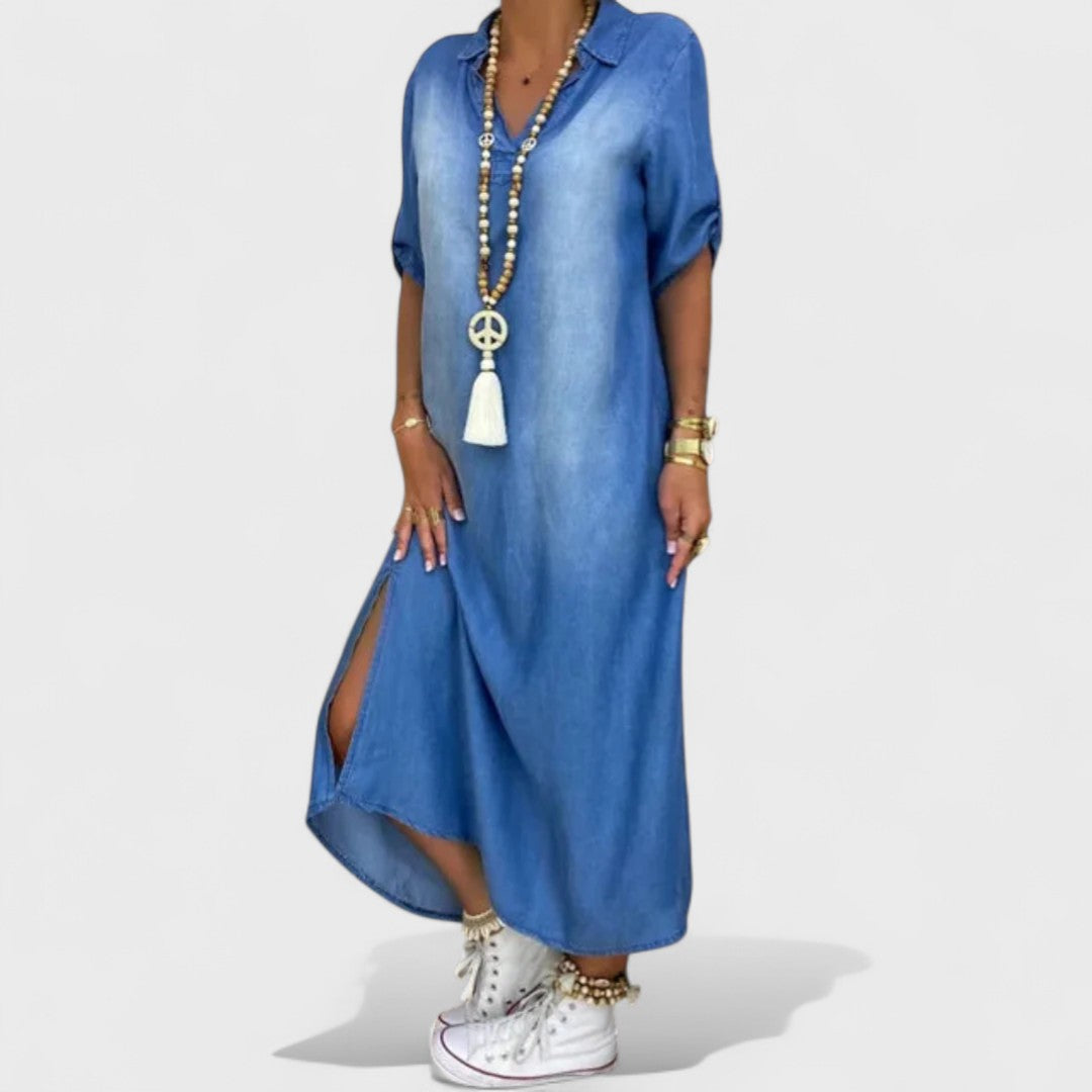 Ez a Mirka ruha a farmer szövet könnyedségét kínálja, egyszerű, kedves sziluettel kombinálva. A V-nyakú kivágás kiemeli a dekoltázst, míg a finoman hangsúlyozott derék elegáns arányokat kölcsönöz természetes kényelemmel. Ideális választás városi sétákra, kirándulásokra és mindennapi viseletre — stílusosan nézel ki és kényelmesen érzed magad.