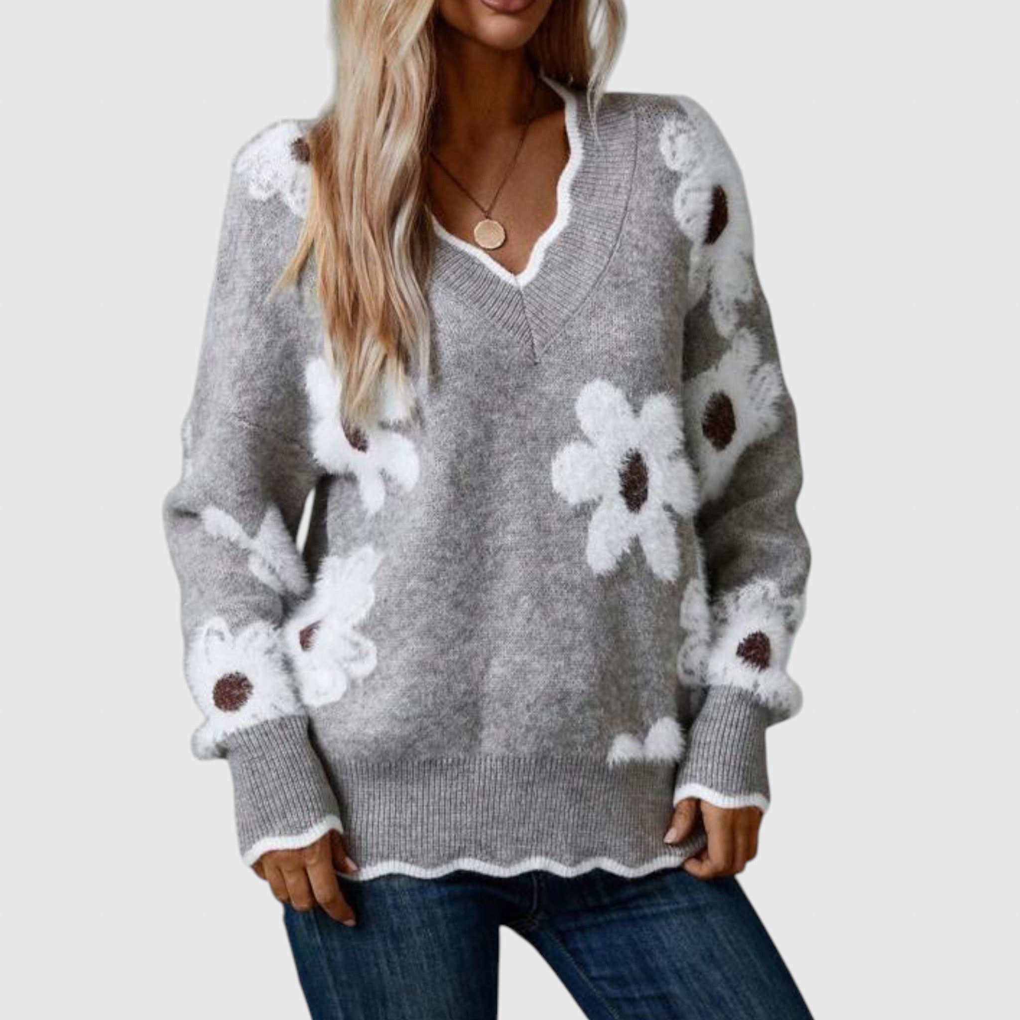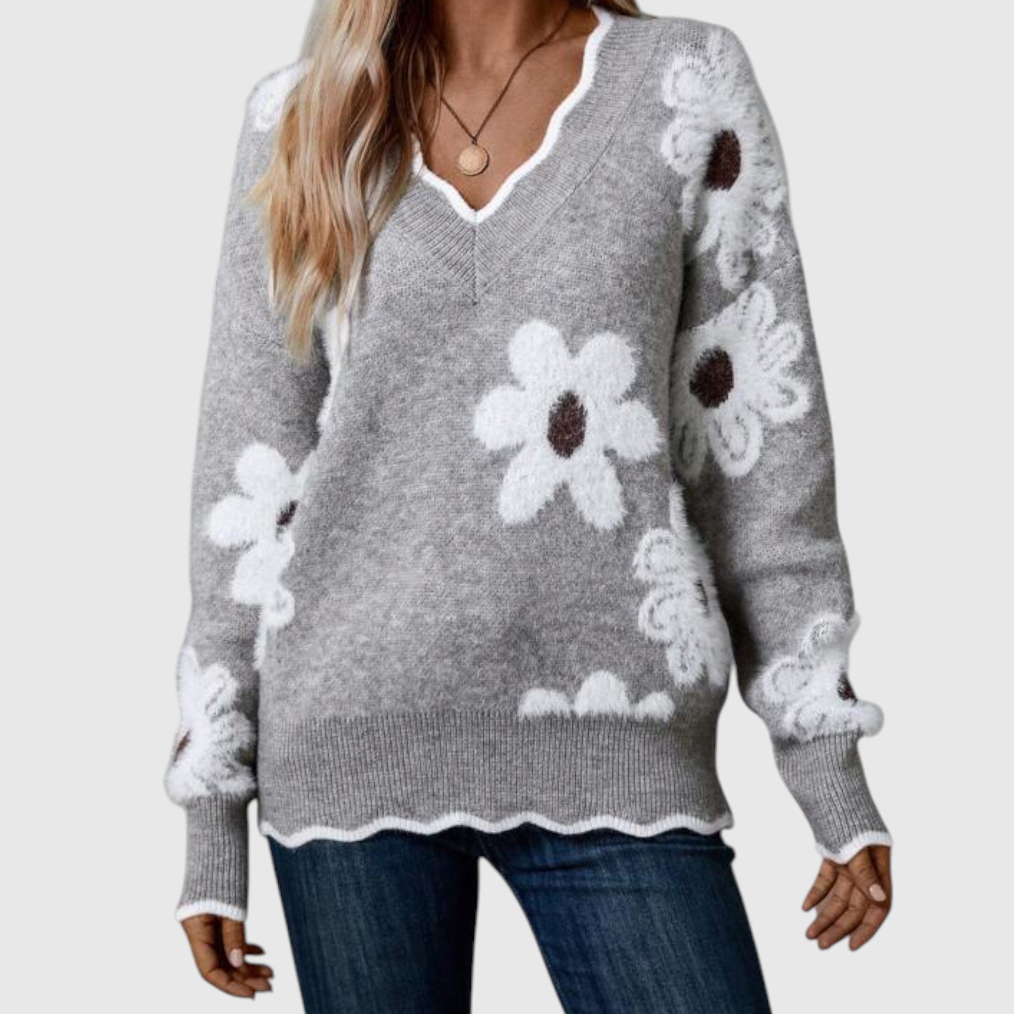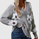 THEA - Elegáns V-nyakú pulóver virágmintával