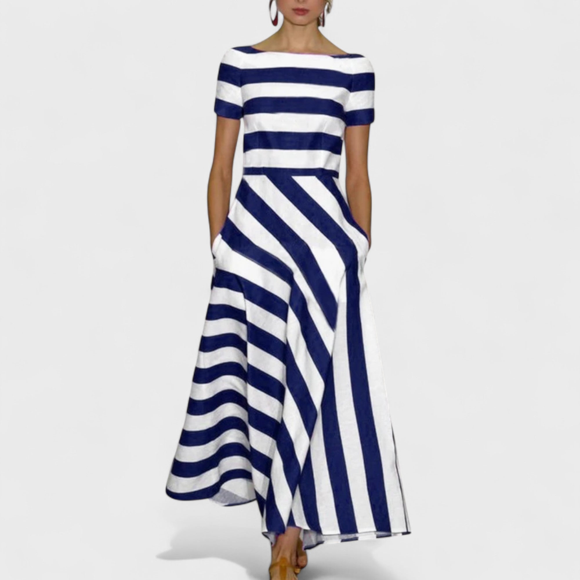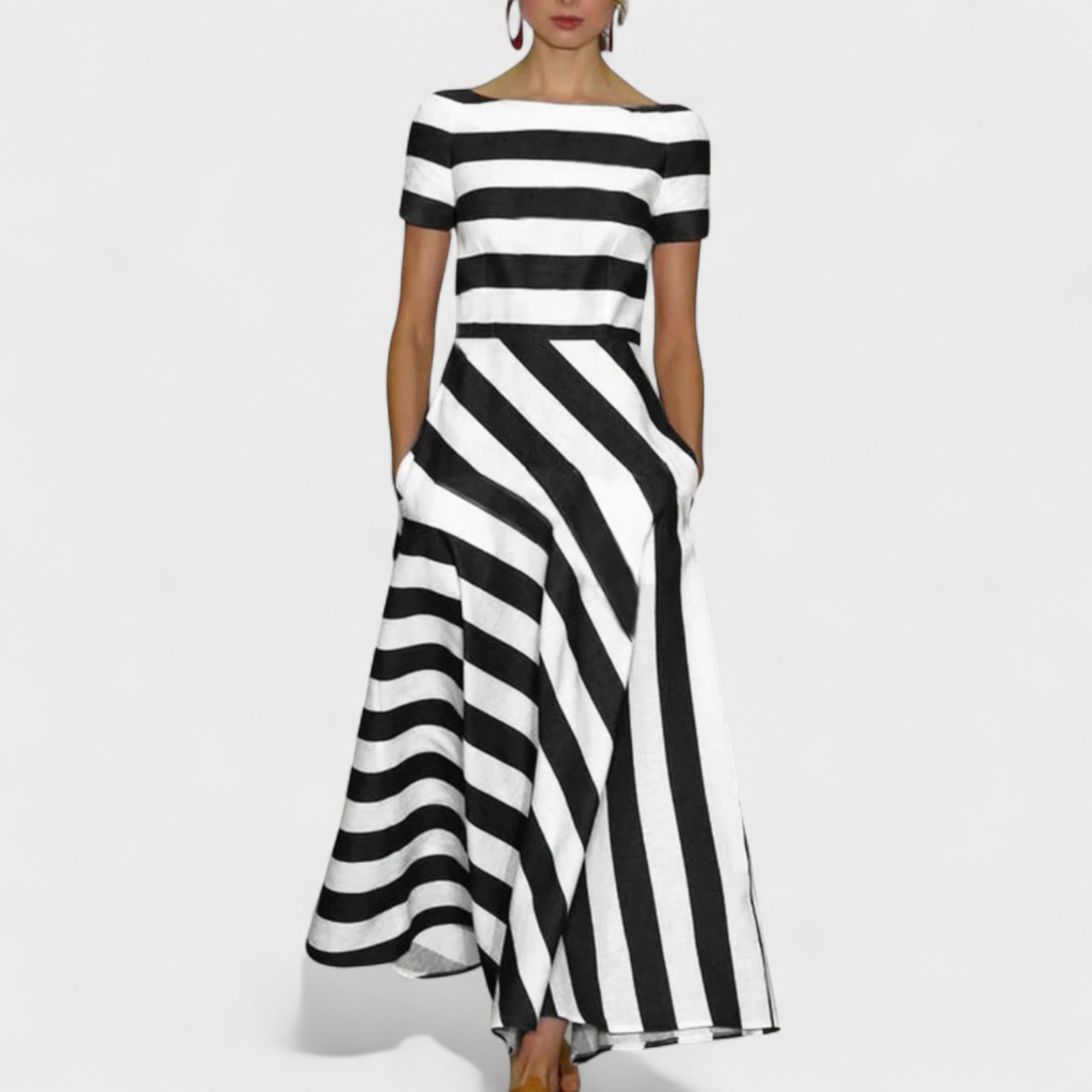 • Réteges csíkok & testhezálló derék – optikailag karcsúsítja a sziluettet, és finom grafikai eleganciát ad hozzá felesleges zaj nélkül.